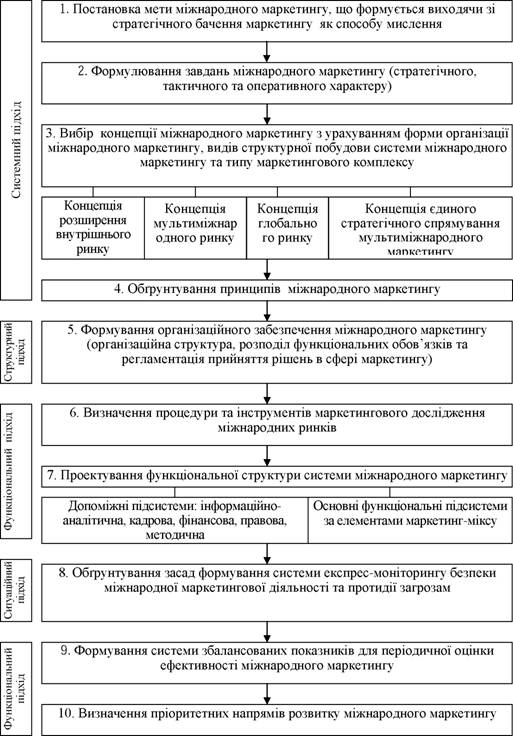 управлінських функцій у сфері маркетингу); 2) процесного (міжнародна