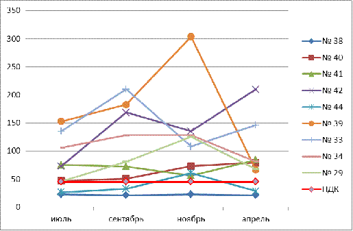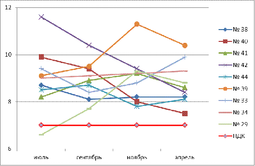 превышает нормы СанПиНа, максимальное значение выше ПДК в 6,7 раз,