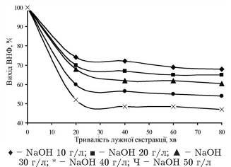 розчину гідроксиду натрію і тривалості стадії лужної екстракції зменшує вміст