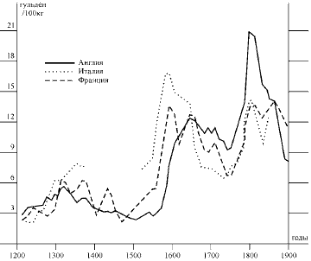 на зерно за 700 років (1200-1900 рр.) в Англії, Франції та Італії як
