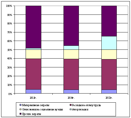 затрат за 2013 - 2015гг указывает на преобладание расходов на оплату труда и прочих