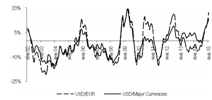 доллара к евро и валютам стран - основных торговых партнеров, в % к предыдущему