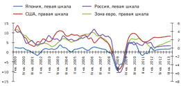 ВВП в Японии, зоне евро, США и России, 2000-2013 годы, % к предыдущему году