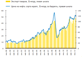 сезонной корректировкой) и динамика цен на нефть сорта юралс, 2000-2012 годы