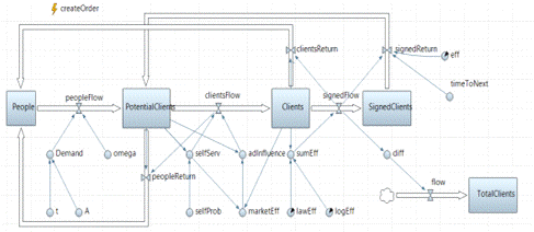 программном продукте AnyLogic, был использован метод системной динамики, процессный подход и агентное