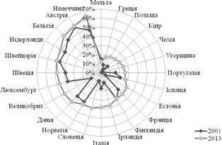 відходів у країнах Європи у 2001 та 2013 рр. [5].