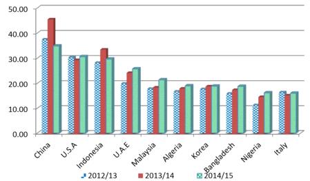 Мировой экспорт и импорт сахара с 2011-2015 гг., тыс. тонн