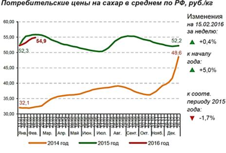 Динамика средних цен производителей сахара с 19.01.2015-15.02.16
