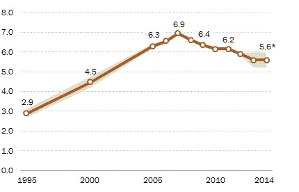 Рисунок 2. Динамика нелегального населения США, 1995-2014, млн. чел.