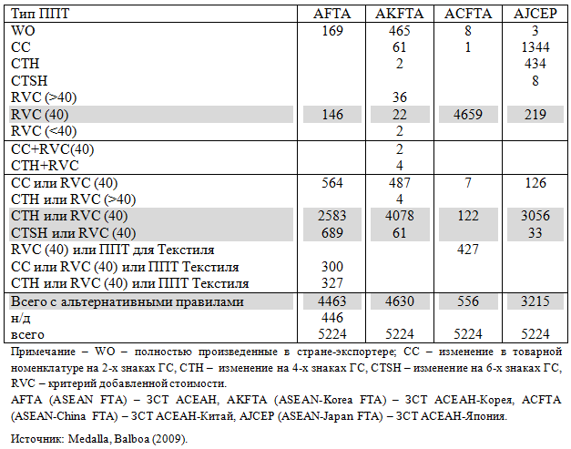 различных соглашений о свободной торговле в части правил происхождения в сфере