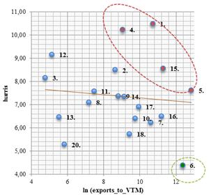 факторов. Здесь учитывалось влияние на объемы экспорта следующих переменных: