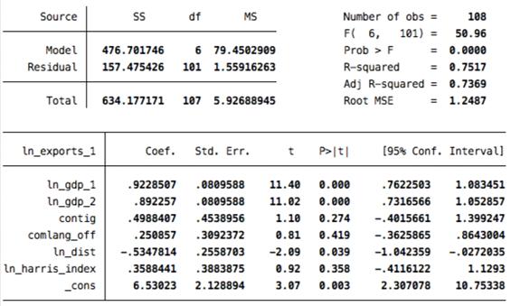 Зависимость объема экспорта от уровня ВВП, наличия общей границы, общего языка,