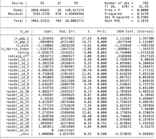 расстояния между странами и индекса Харриса с дамми-переменными по разделам