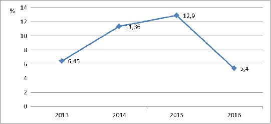 ∆Rпр2014=((174790-155484)/174790-(213561-155484)/213561)*100=-16,15