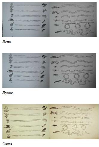 линии дрожащие -12 линии прерывистые - 3, линии с сильным нажимом - 1,