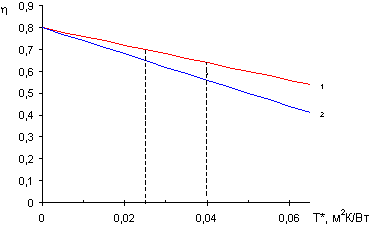 КПД, T* – приведённая разность температур, К – эффективный коэффициент тепловых