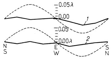Кривая1 соответствует полуденным наблюдениям, кривая2 – вечерним. Пунктирные