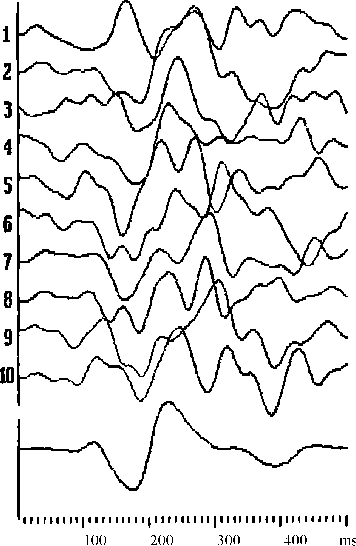 Рис.2. Верхние 10 кривых v единичные вызванные потенциалы,