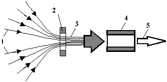 На Рис.2 показаны: 1 - первичные пучки ДЗЧ; 2 - рассеивающая магнитная